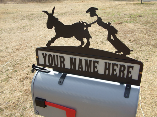 This is photo of Deluxe mail box topper showing a stubborn little Donkey being encouraged by his rider. Please let me know if you would like your last name or your address on the topper.